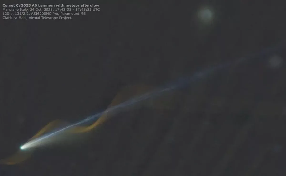 Menguak rahasia langka di langit! Astronom mengabadikan interaksi visual menakjubkan antara Fenomena Komet Lemmon dan Jejak Meteor Spiral yang berputar.