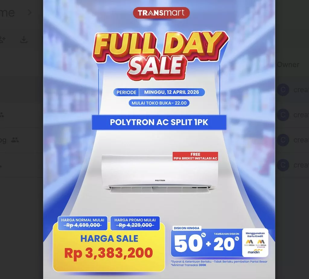 Harga AC Split 1 PK Polytron Diskon di Transmart Full Day Sale