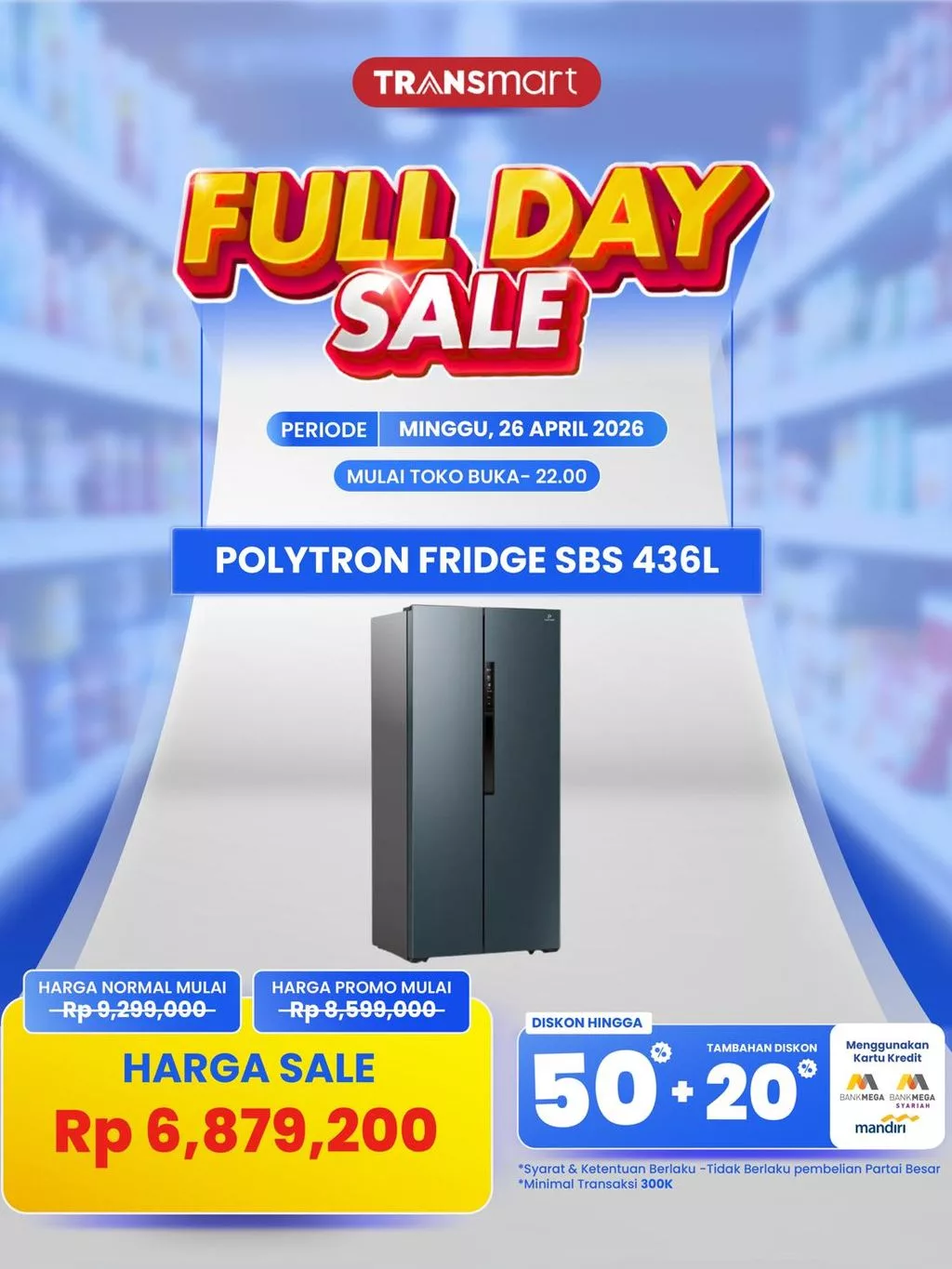 Kejutan tidak berhenti sampai di situ. Pelanggan bisa mendapatkan Harga Kulkas Polytron 436L Transmart yang jauh lebih murah jika bertransaksi menggunakan kartu kredit dari mitra perbankan tertentu. Pengguna kartu kredit Bank Mega, Bank Mega Syariah, dan Bank Mandiri berhak mendapatkan diskon tambahan sebesar 20%. Dengan tambahan potongan tersebut, harga final yang harus dibayarkan hanya sebesar Rp6.879.200.