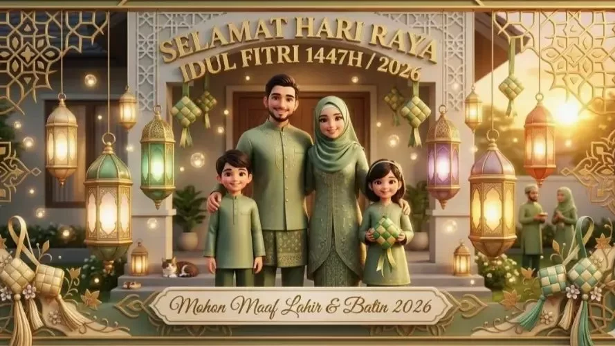 Contoh Prompt: “Transformasikan foto keluarga saya menjadi elemen utama dalam dunia mini Lebaran yang imut bergaya diorama. Keluarga tampak seperti figur miniatur lucu di atas meja makan kayu yang penuh dengan hidangan hari raya. Kelilingi dengan ketupat raksasa, mangkuk opor ayam besar, dan kue nastar yang melayang. Tambahkan lampion kecil dan rumah bergaya lego. Gunakan warna-warna pastel cerah dengan perspektif top-down sedikit miring. Tambahkan teks playful: ‘Selamat Idulfitri 1447 H dari dunia kecil kami! Maaf lahir batin, yuk main bareng lagi!’ Gaya whimsical, detail tinggi, sangat menggemaskan.”